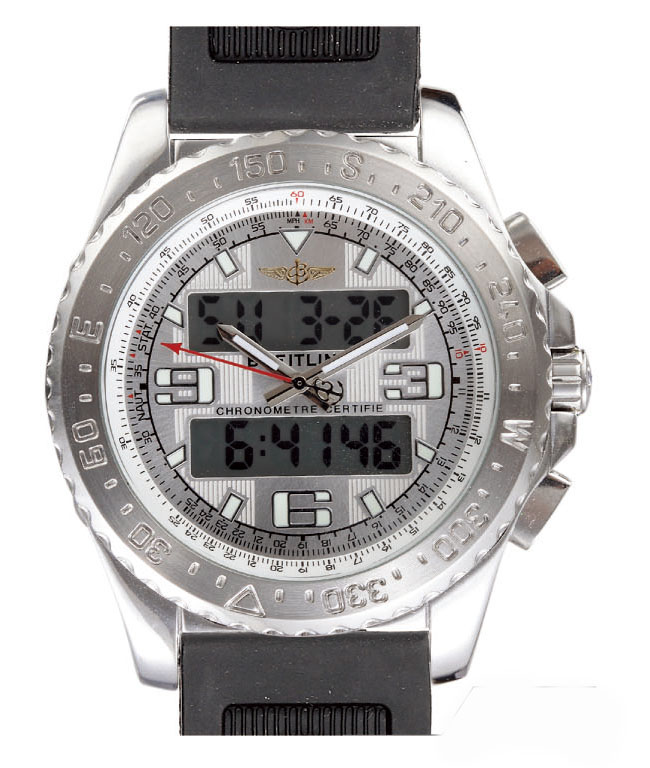 case with a strap. bezel. dial with luminous hands and index hour markers. Tachymeter scale appears around the outer rim. Dial Type: . Date display position. Chronograph - sub-dials displaying: . Japanese Quartz movement. Scratch resistant . Screw down crown. Case diameter: mm. case shape. Deployment clasp. Water resistant at 100 meters / 330 feet. Functions: chronograph, date, hour, minute, second. Luxury watch style. Watch label: Swiss Made. Breitling Chronomat B01 Working Chronograph White Dial with Stick Marking-2009 New Model.