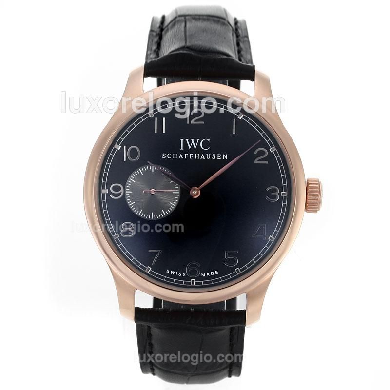 - IWC Portuguese Automatic Rose Gold Case Number Markers with Black Dial-Leather Strap