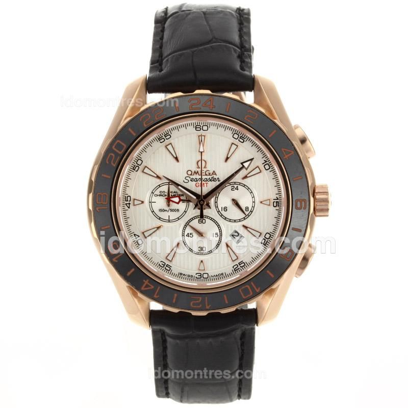 - Omega Seamaster Planet Ocean GMT Working Chronograph Rose Gold Case White Dial with Leather Strap-Ceramic Bezel
