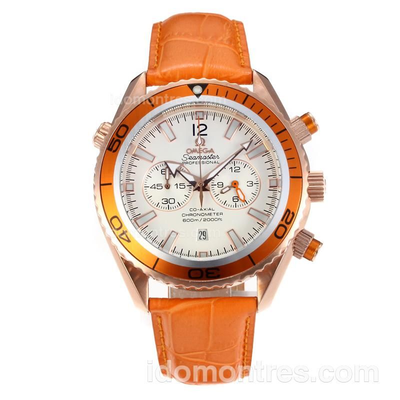- Omega Seamaster Working Chronograph Rose Gold Case Orange Bezel with White Dial-Orange Leather Strap