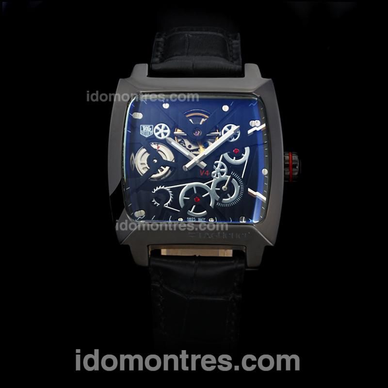 - Tag Heuer Monaco V4 Tourbillon Automatic PVD Case with Black Dial-Leather Strap(Gift Box is Included)