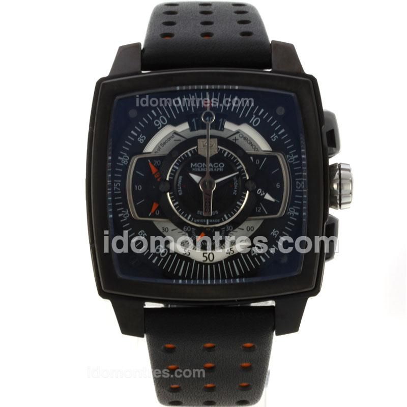 - Tag Heuer Monaco Working Chronograph PVD Case with Black Dial-Leather Strap