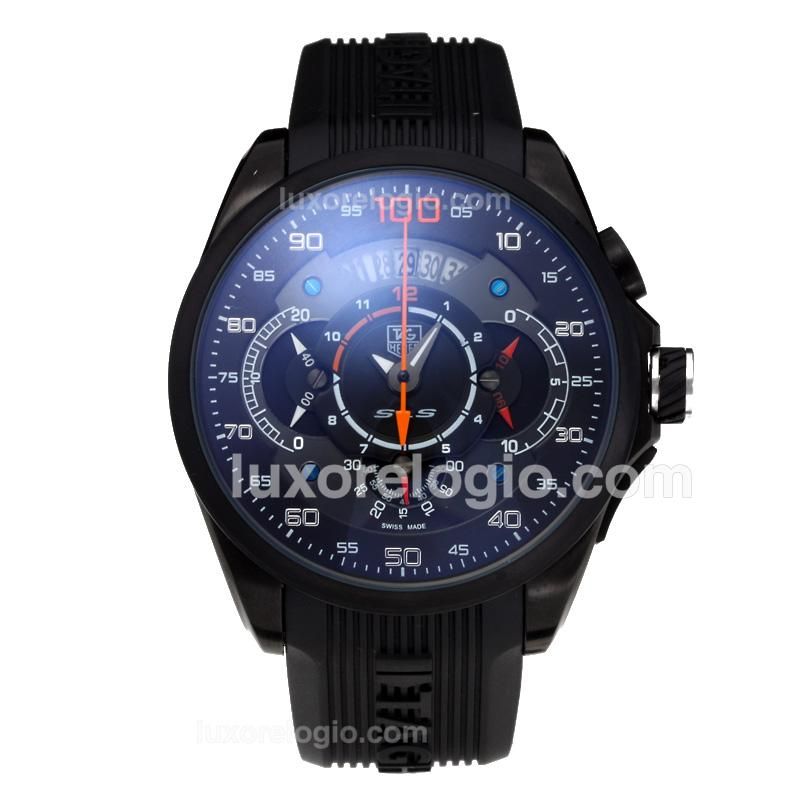 case with a strap. bezel. dial with luminous hands and index hour markers. Tachymeter scale appears around the outer rim. Dial Type: . Date display position. Chronograph - sub-dials displaying: . Asia Automatic movement. Scratch resistant . Screw down crown. Case diameter: mm. case shape. Deployment clasp. Water resistant at 100 meters / 330 feet. Functions: chronograph, date, hour, minute, second. Luxury watch style. Watch label: Swiss Made. Tag Heuer Formula 1 Flyback Function Working Automatic PVD Case with Blue Dial-Rubber Strap.
